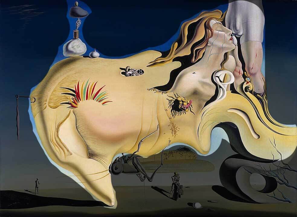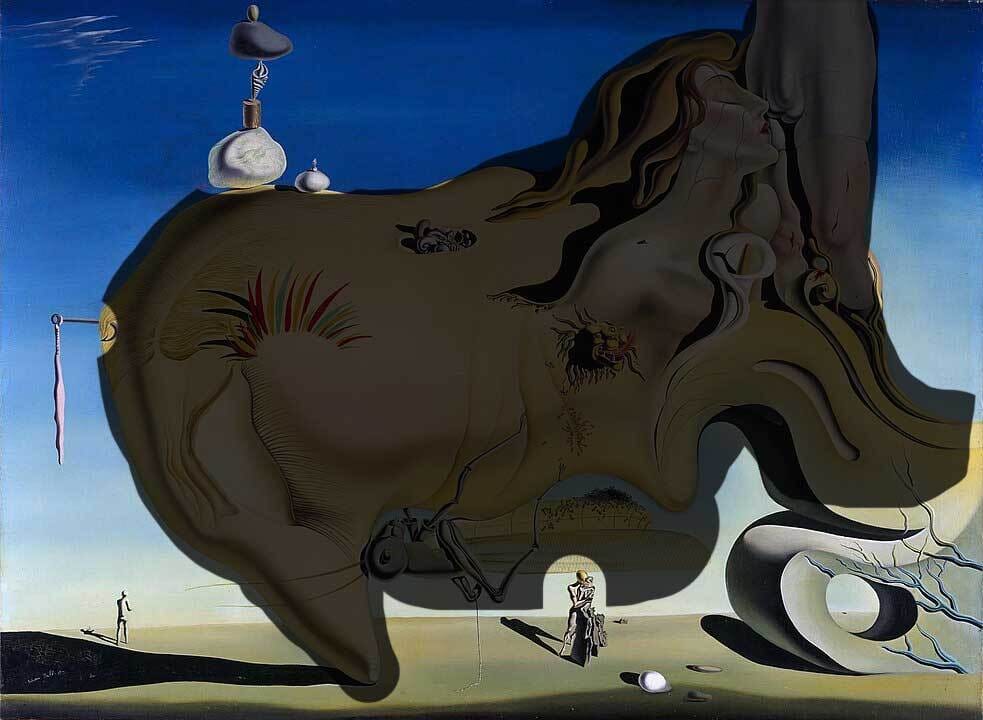 In the upper part of the main distorted head (which itself lies face-down), a female figure - often interpreted as Gala, Dalí’s muse - emerges from the head. She is both the object of desire and tension, intimately tied to his fears and fantasies. Her body is ethereal, delicate, yet assertive. Within the landscape of the mind, she represents the erotic impulse, the lure that both fascinates and terrifies.