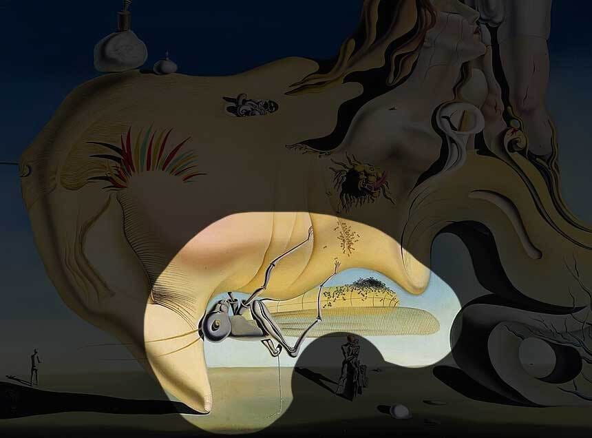 Across the “mouth” area, a large grasshopper is perched. It’s one of Dalí’s recurring phobias and symbols. This insect, decomposing, associated with decay and repulsion, intrudes upon the erotic imagery and suggests fear, corruption, or contamination - an ambivalent presence in the erotic fantasy.