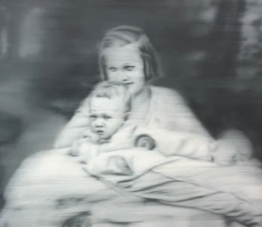 The infant in Marianne's arms is believed to be Richter himself. But he's not the focus, we strain to see his features, almost lost in the haze. The child represents both personal memory and the future unaware of its past. He’s being held by someone whose fate he cannot know. The tenderness of the pose contrasts brutally with the history behind it.